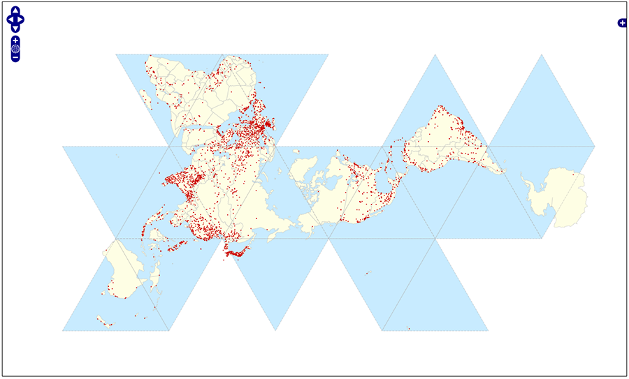 You may notice that the dot density representation takes a while to process. The basic strategy for creating a dot density layer is to figure out how many dots need to be placed for each polygonal feature, and then to place those dots randomly within the bounds of the features. To accomplish this goal, dots are randomly placed within the bounding box of each feature and then tested to see if they actually lie within the feature. Though this requires some processing, it doesn’t need to be as slow as the current implementation in this library. It is slow only because I decided to use the built-in containsPoint method of the OpenLayers Polygon geometry class. This point-in-polygon method requires that random points be tested one-at-a-time; a much faster strategy (the one Andy and I used when developing this symbology for Indiemapper) is to use a points-in-polygon test that can test many points at a time. Eventually I’ll implement that method here but for now this class should work plenty fast with a small number of features and relatively high dotValue.